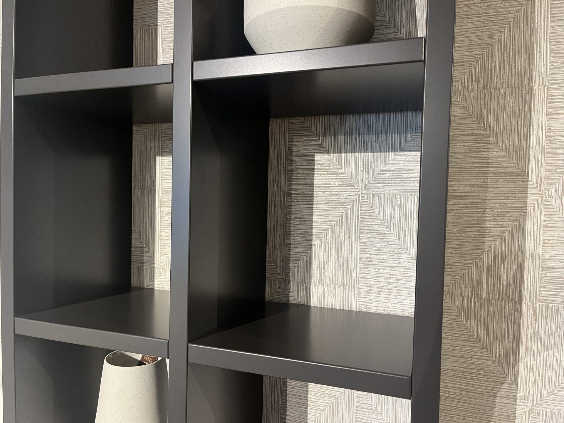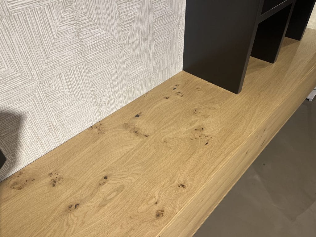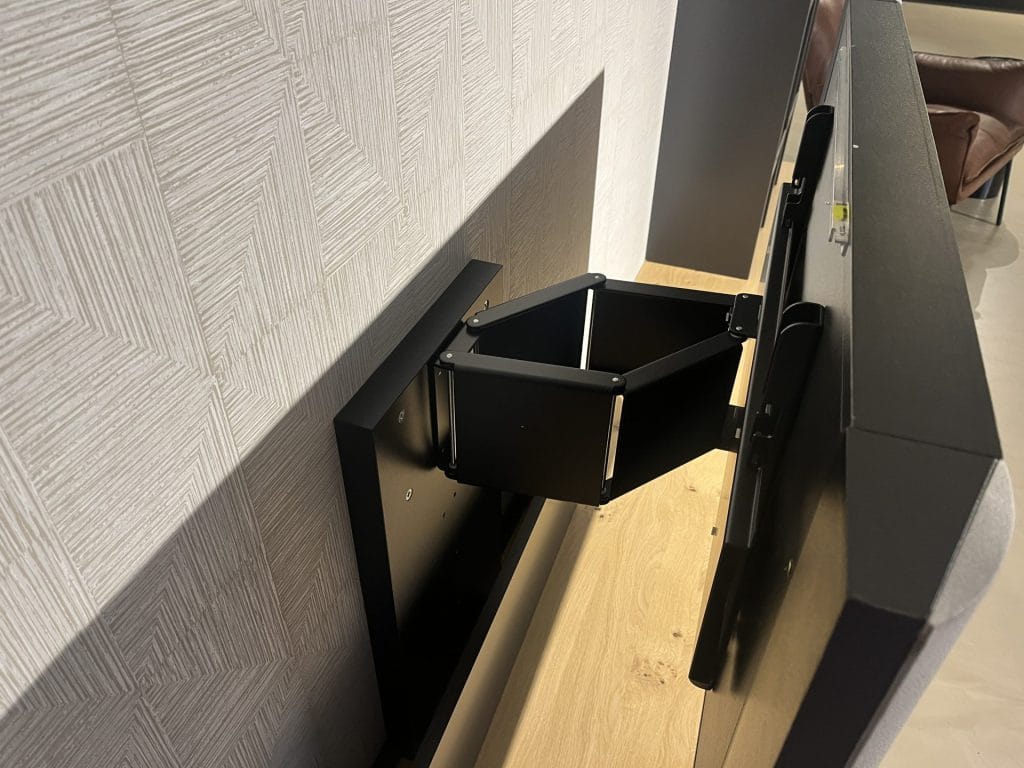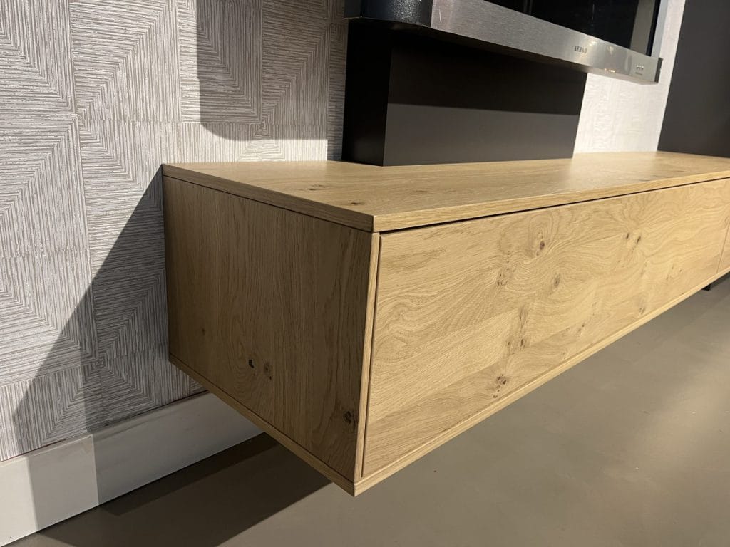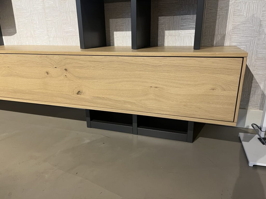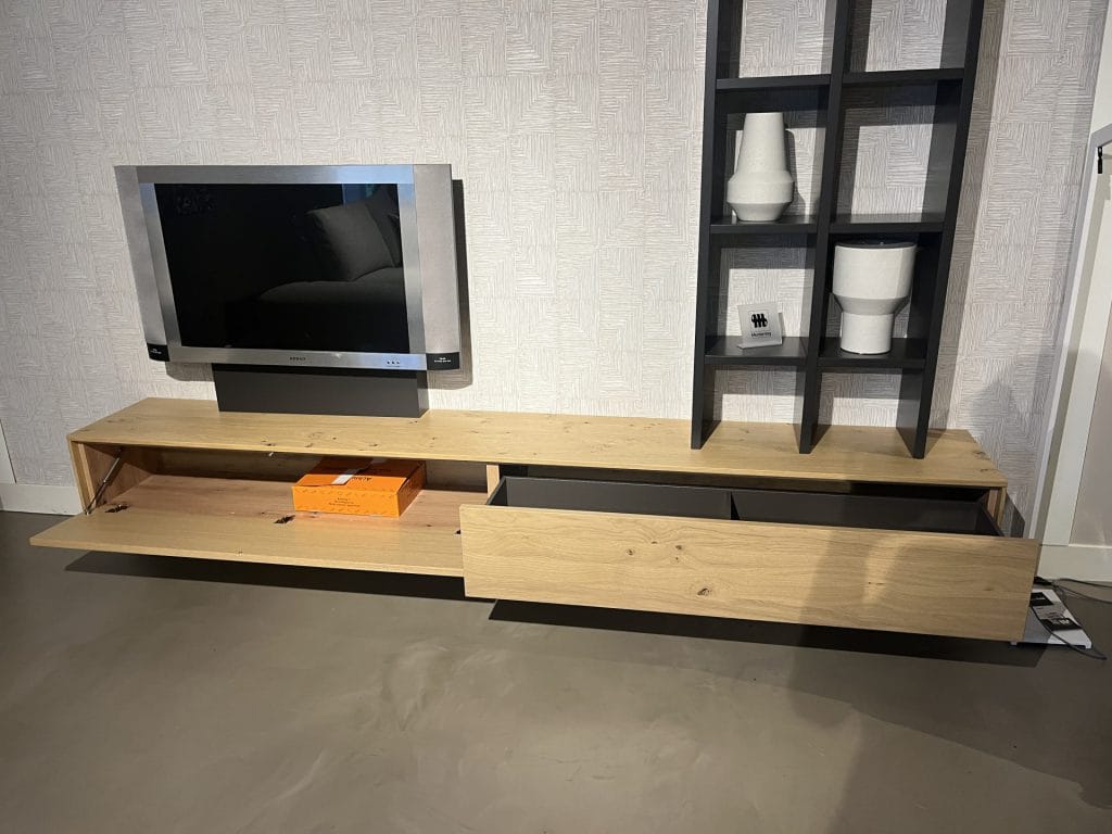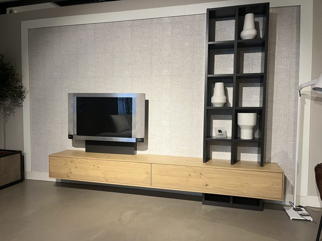 Dit prachtige wandmeubel combineert een tv dressoir van genoest eiken met een grafiet gelakte boekenkast. De uittrekbare tv houder en deuren met push-to-open mechanisme voegen gemak toe aan het gebruik van het meubel.